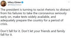 - 希拉里批特朗普“中国病毒”言论:种族主义 掩盖失职